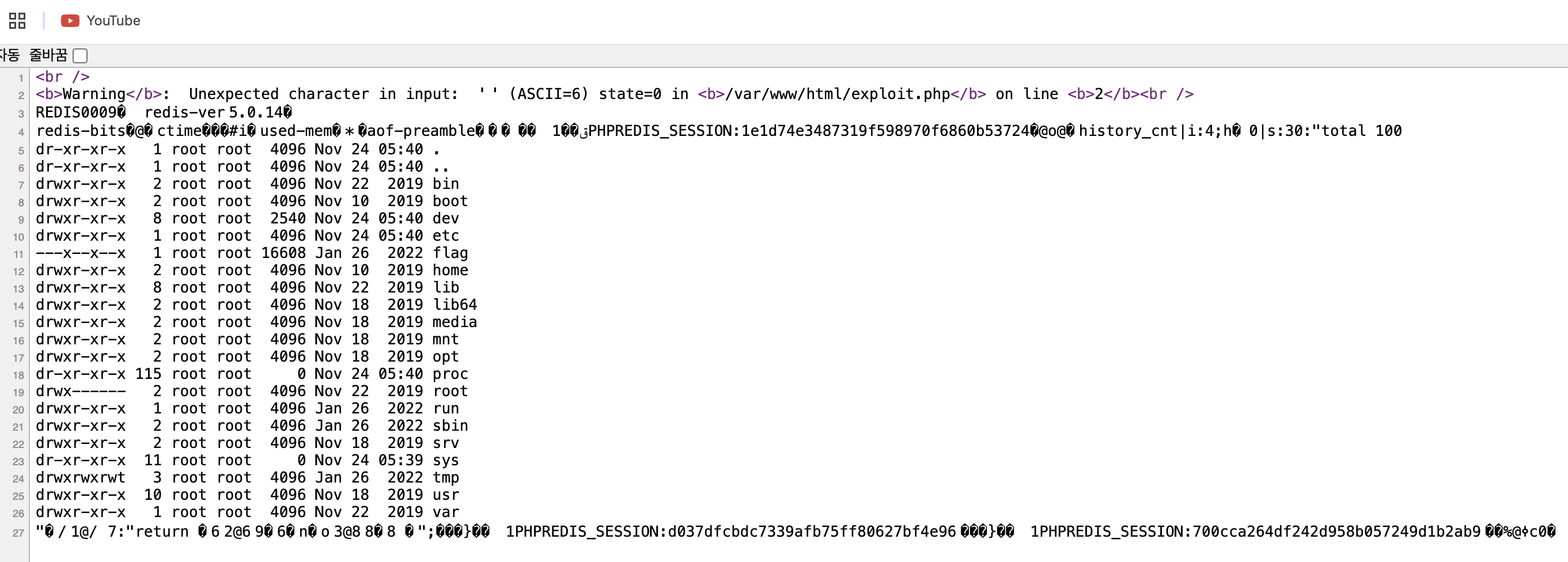 그러면 웹쉘이 업로드되고 /exploit.php?cmd = ls -al / 로 이동해보면 아래와 같이 나온다.