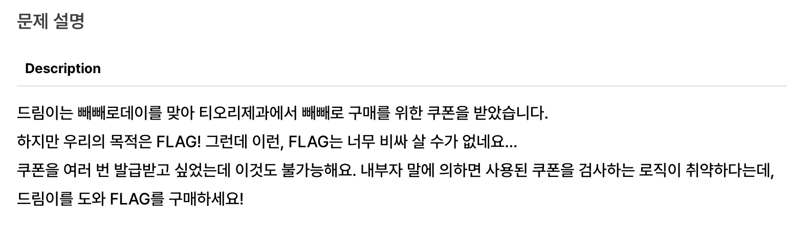 문제 설명에는 이렇게 써져 있는데 쿠폰을 레이스 컨디션 등을 통해 여러 번 적용시킬 수 있는 거 같다.