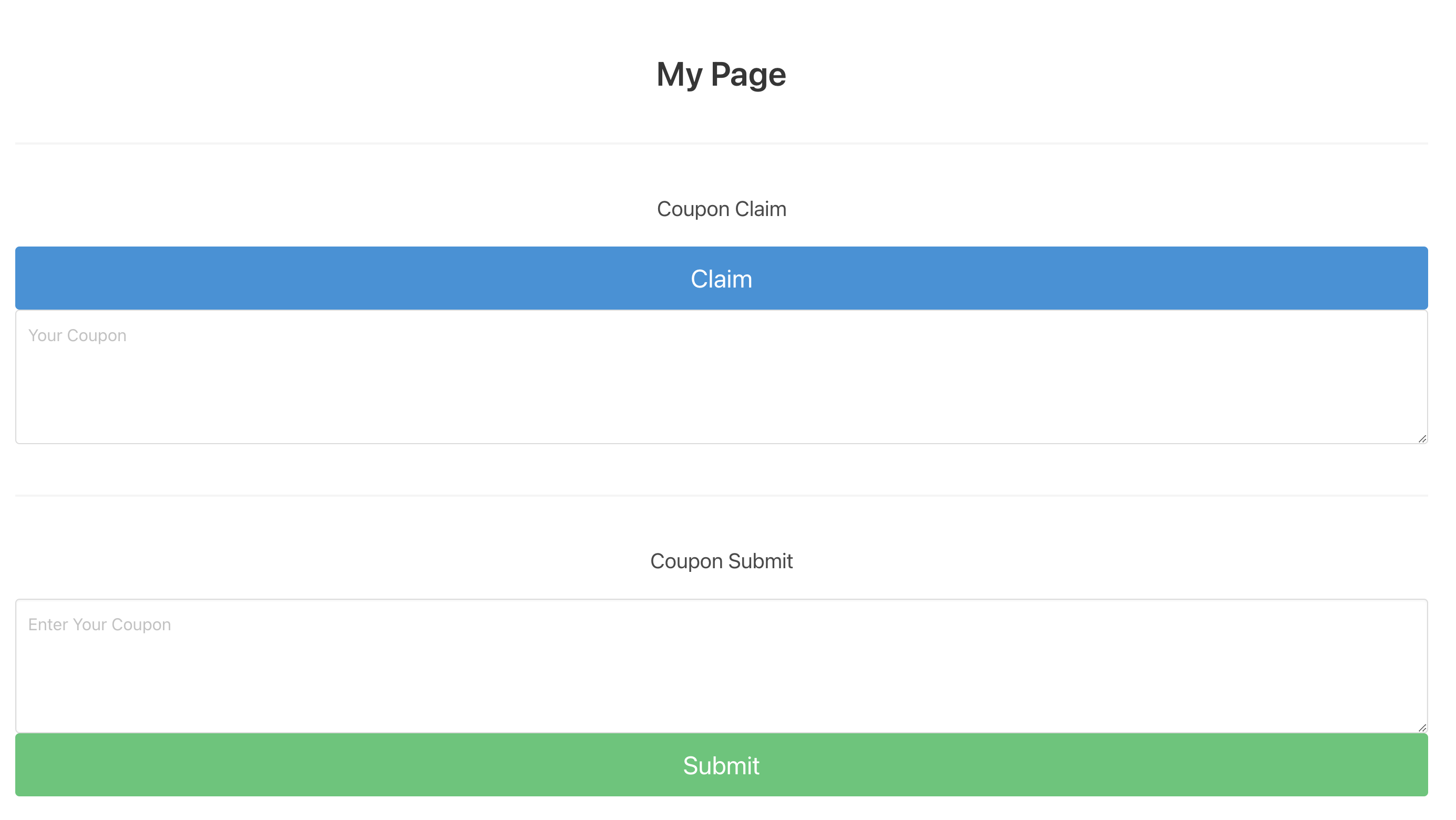MYPAGE 버튼을 누르면 위와 같이 나오고 Claim 버튼을 눌러서 쿠폰을 발급받을 수 있고 Submit에 쿠폰을 입력하여 쿠폰을 적용시킬 수 있다.